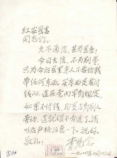 1984年10月26日的亲笔信,为何李先念会写下这封信呢?原来1983年6月,在第六届全国人民代表大会上李先念当选为中华人民共和国主席,老家红安县的乡亲们知道这个消息后十分高兴。1984年10月初,红安县委的同志赴京看望李先念,顺便带去了红安的特产两斤天台山茶叶和10斤红安红苕。11月初,县委就收到了李先念的亲笔信。从这封信件可以看到李先念一心为公的作风。