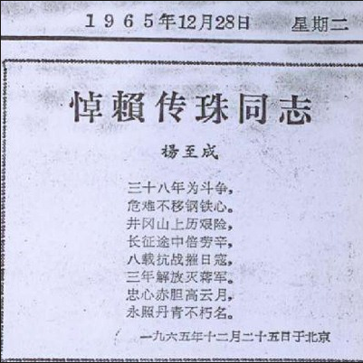 中华人民共和国国防部:赖传珠是中国共产党的优秀党员,是中国人民解放军优秀的指挥员和政治工作人员,是中国人民的忠诚战士。赖传珠,为了党和人民的事业,三十八年如一日,把毕生精力献给了伟大壮丽的中国人民解放事业和共产主义事业。他长期做政治工作,有丰富的政治工作经验,对军队政治工作建设做出了很好的贡献。他忠于人民,忠于革命,忠于党的事业。在长期的革命斗争中,始终如一地坚决拥护和贯彻执行党和毛主席的一切指示,对党和人民的事业建立了卓越的功勋。
