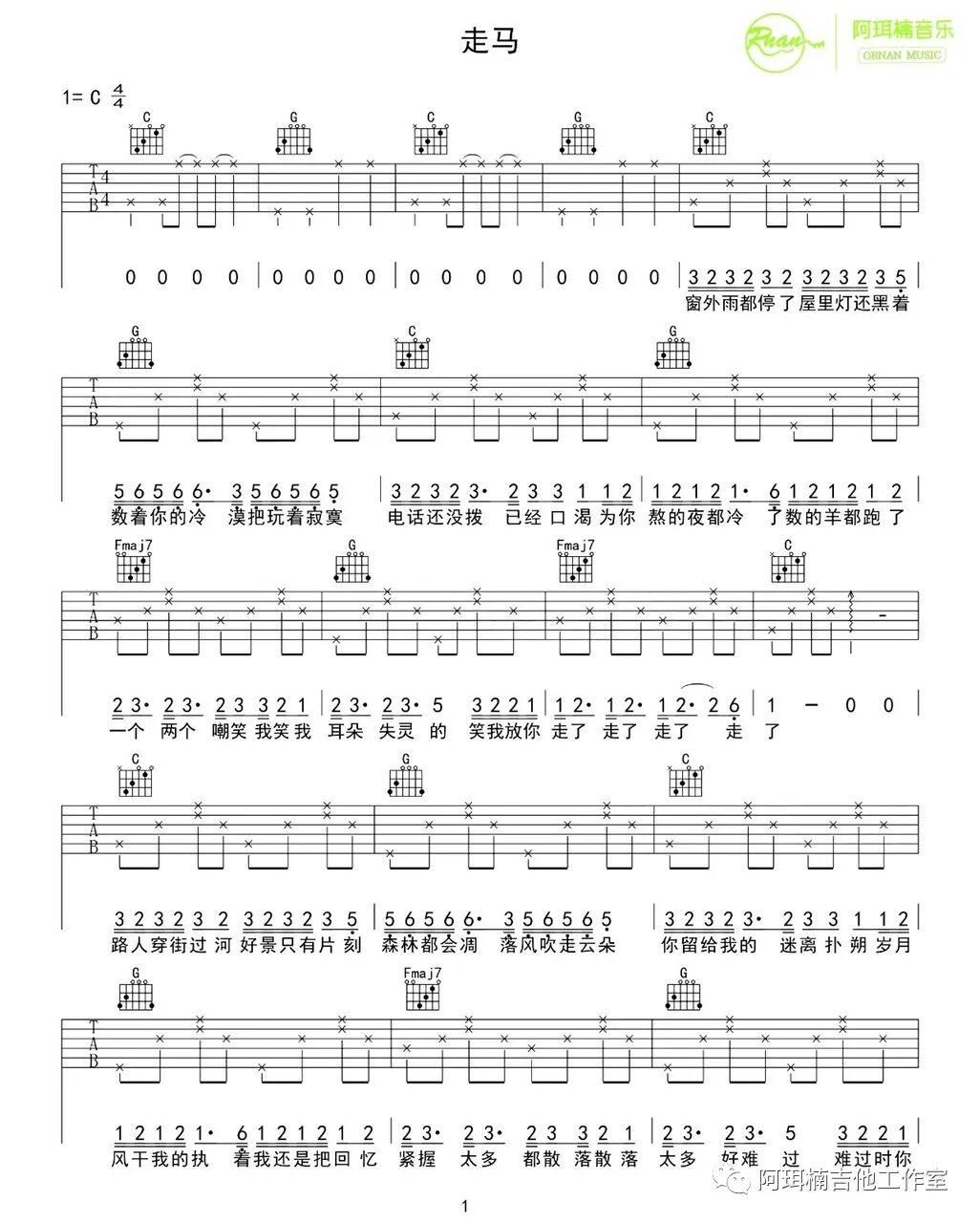 走马吉他谱,没有大横按。陈粒演唱,一首经典民谣创作歌曲。《走马》吉他弹唱谱,采用C调指法编配,原调编配,不用变调夹,三张图片六线谱。