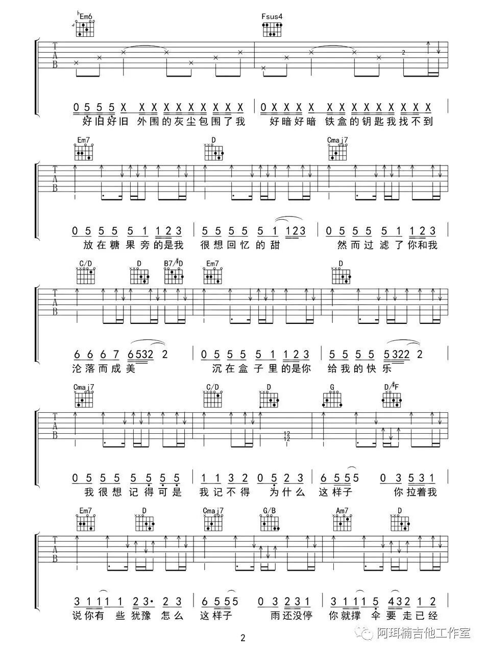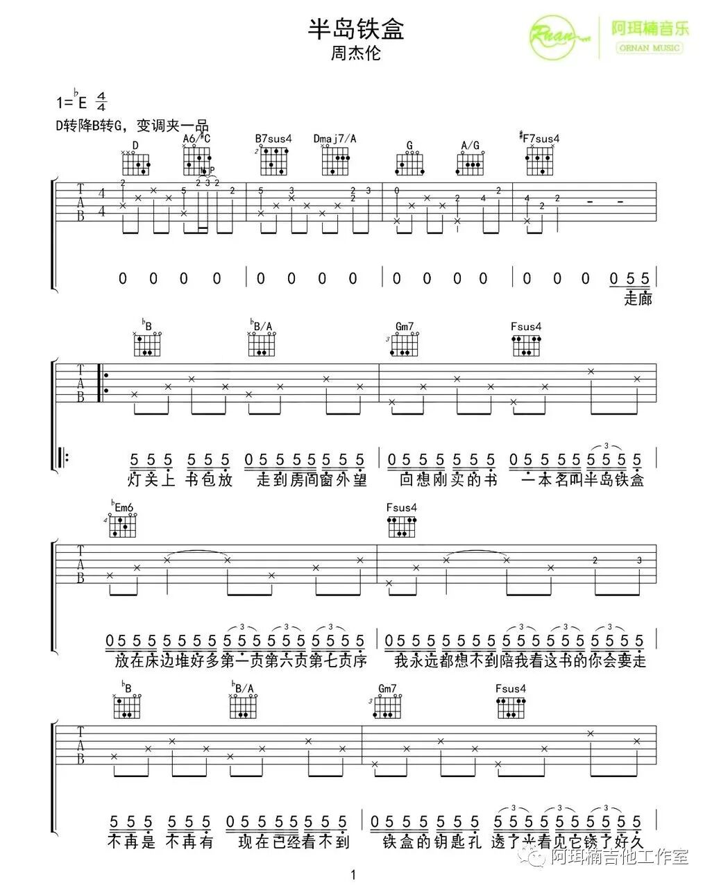 半岛铁盒吉他谱,周杰伦演唱,小姐请问一下,有没卖半岛铁盒。在歌曲中,岁月或深或浅地铭刻着。《半岛铁盒》吉他弹唱谱,原调bE,采用D调转B转G调和弦编配,变调夹夹一品,完整版六线谱共三张图片