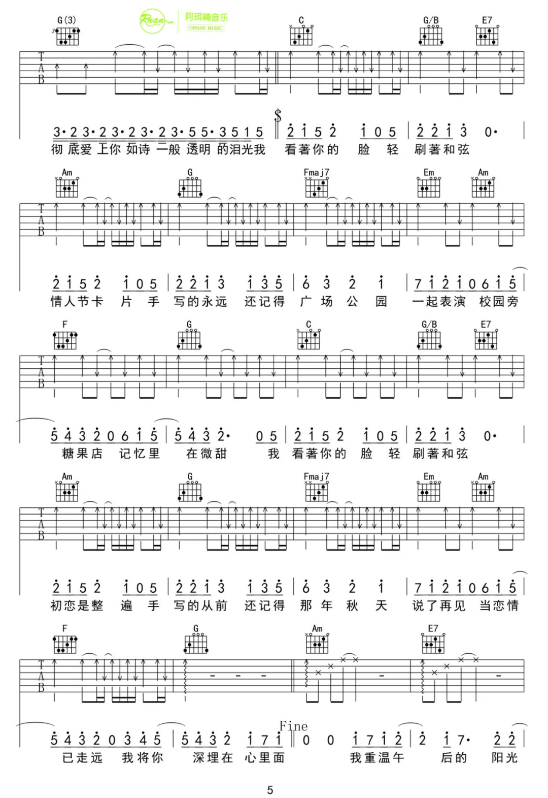 ○浓浓的纯爱风,用简单的吉他前奏,中间穿插一点钢琴,衬着周杰伦轻轻吟唱,彷佛在空荡的校园教室里,安静回忆着当时的初恋情景。间奏之后二段主歌截然不同,鼓声一进之后曲风变饶舌,彷佛将时空拉回到初恋现场,那个曾经一起弹琴的公园、糖果店的青涩微甜。