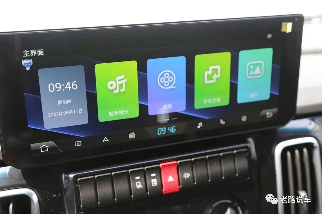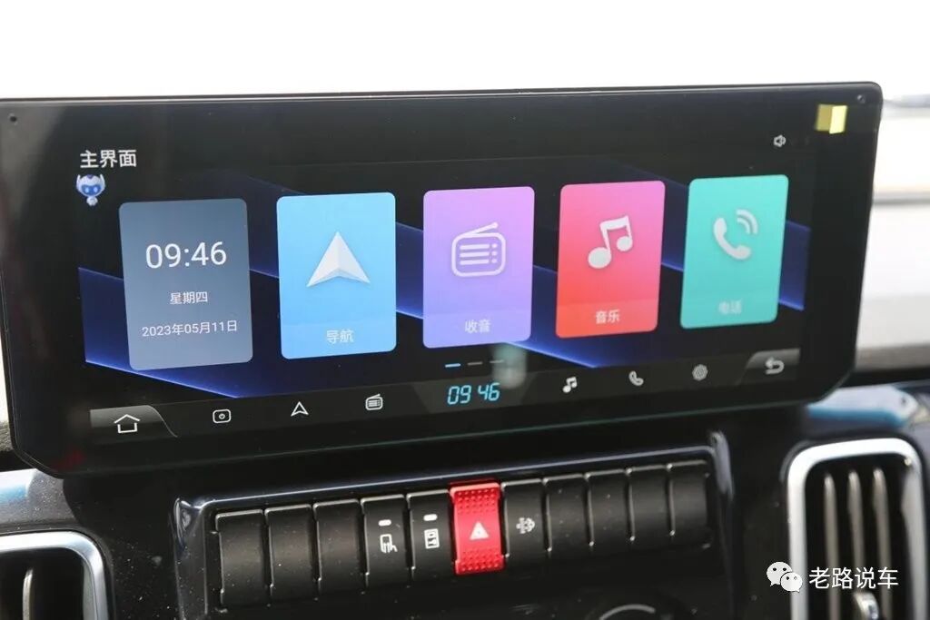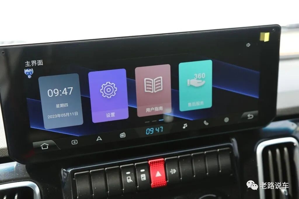 液晶屏的功能很多,可以通过触摸操作。左侧显示的是时间和日期,此外还有导航、收音、音乐、电话、娱乐、视频、手机互联、图片、设置、用户指南、售后服务等功能,操作起来十分流畅顺滑。