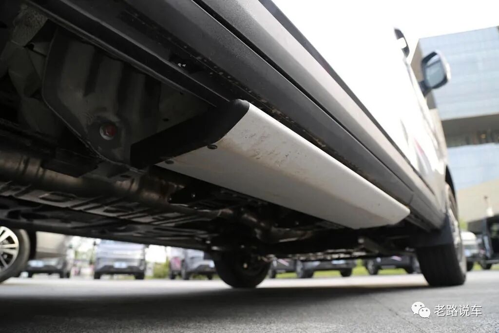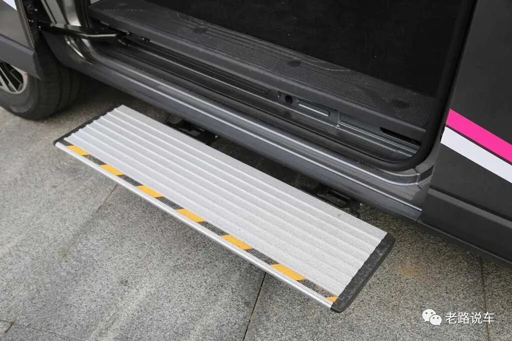 实拍车型在侧滑门下方配备了电动踏板,踏板上带有黄黑相间提示条纹及防滑的凸起纹路。