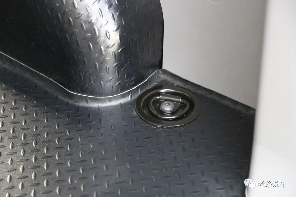 地板上设计有防滑的凸起纹路,就连轮拱也进行了包覆保护。此外底盘、侧壁等多个地方都设计了固定锚点,可搭配固定绳等工具来对货物进行约束。