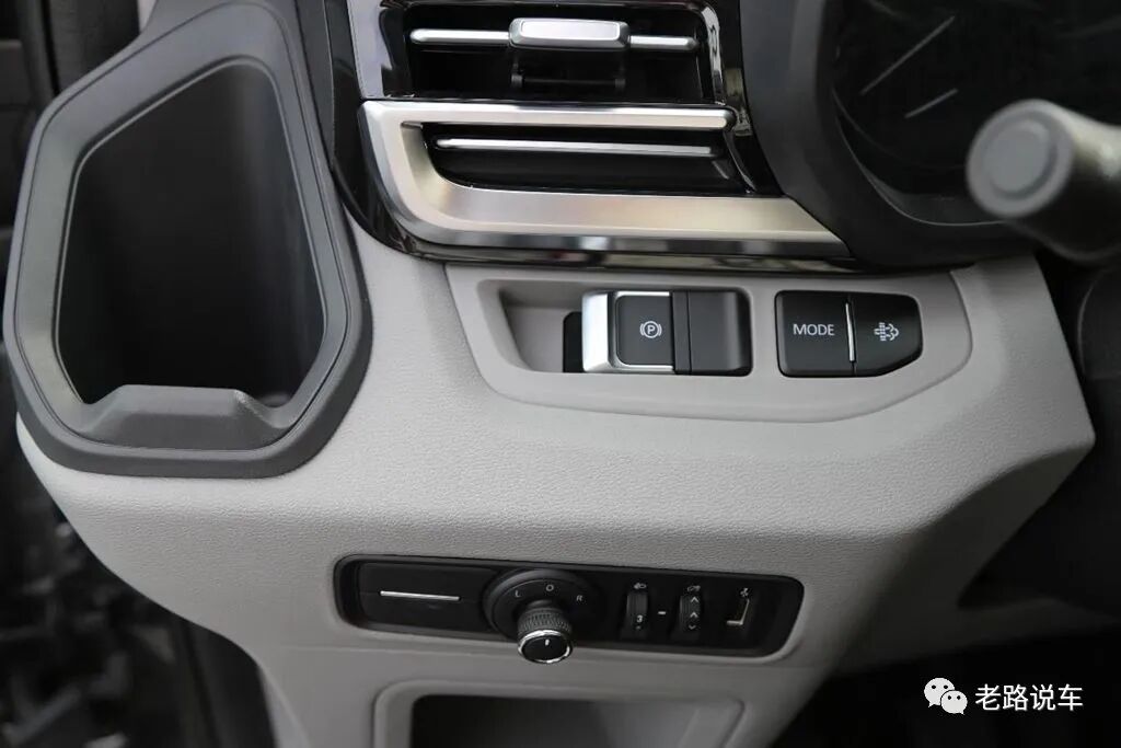 仪表台左侧设计有电子手刹按钮、驾驶模式控制、大灯调节等控制面板,并配备有出风口及杯架。