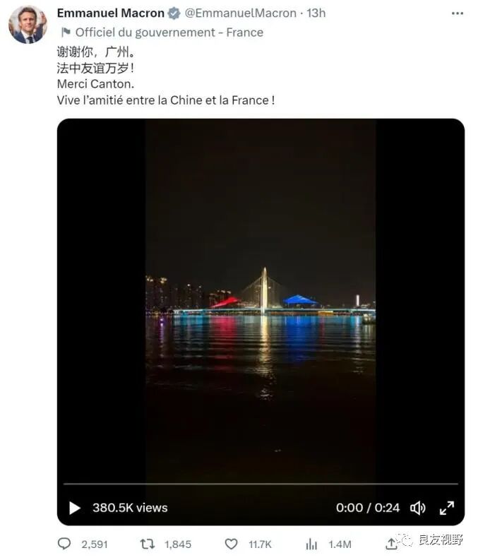 法国总统马克龙应邀对中国进行国事访问,此次访问引发了国际社会广泛关注。尤其是马克龙还在推特上疯狂点赞中国,用中文、法语、英语三种语言发文高呼:法中友谊万岁!这还没完还在推特上发了个广州猎德大桥灯光秀短视频,配文又是中英两种文字“谢谢你,广州。法中友谊万岁”在视频中,可以看到中法两国国旗及和平鸽。由此可以看出马克龙对这次的访问很是满意。