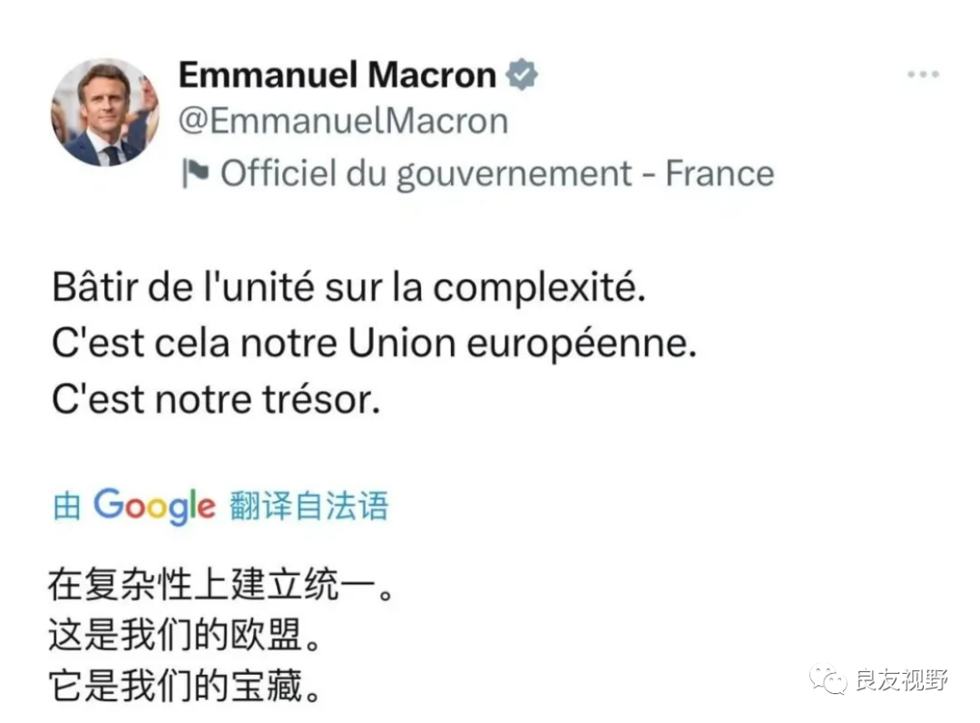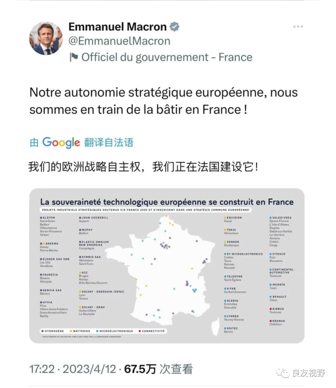 马克龙很少发推,来过中国之后,一反常态。发推特都变得频繁了,再往前看他在不到12小时内就发了两条推。一条是一张法国地图,配了一句话:我们的欧洲战略自主权,我们正在法国建设它。还有一条,则是一篇长长的文章,第一句话就是:我们欧洲的经济主权,这是我们的目标。为了实现这一目标,欧洲已经不再天真。它现在可以捍卫自己的利益、价值观和独立性。中间是谈到了欧洲的市场、产业、竞争等等话题。最后一句话:一个捍卫自身利益和价值观、始终掌控自己的命运、创造就业机会、成功完成气候转型的欧洲,这就是我们正在建设的。