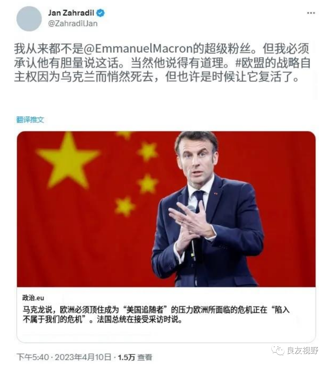 捷克籍的欧洲议员扎哈迪尔在推特上转引了马克龙关于“欧洲不要做美国附庸”的言论,并写道:“我从来不是马克龙的忠粉。但我必须承认,他说这话是有种的。他说的当然有道理。欧盟的战略自主权正在因乌克兰危机而悄然消亡,也许是时候让它复活了。”