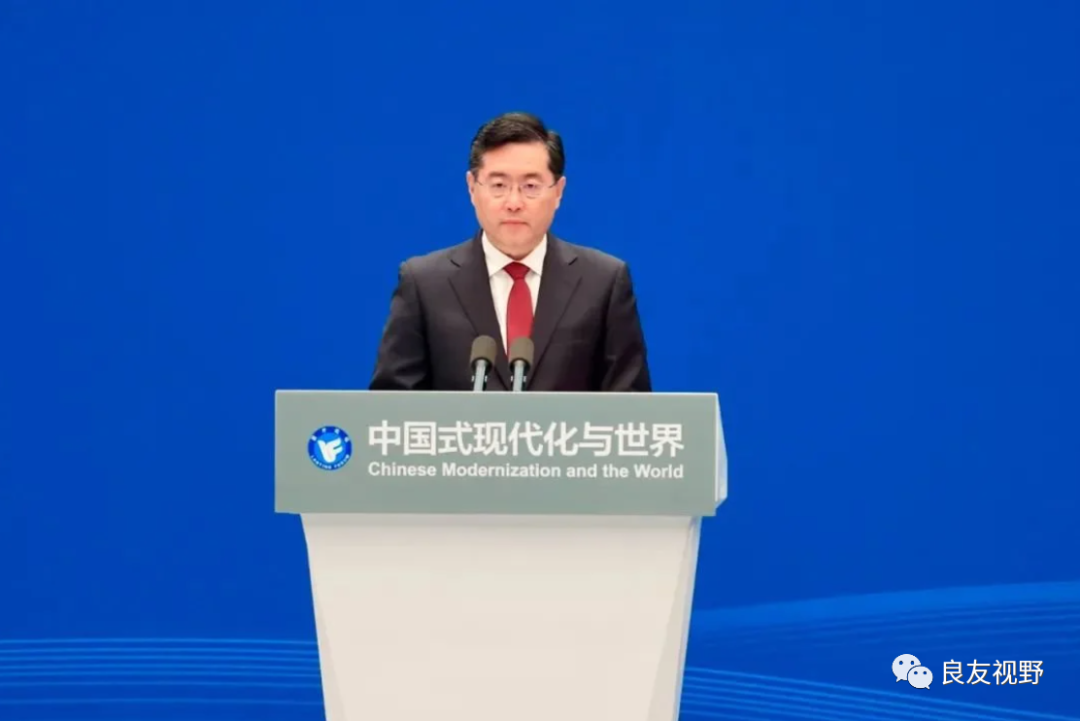 在4月21日上午举行的“中国式现代化与世界”蓝厅论坛开幕式上,国务委员兼外交部长秦刚发表了主旨演讲。