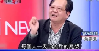 还有大陆禁止进口台湾凤梨后,名嘴黄创夏表示,平均每位台湾民众只要吃18公斤的凤梨,用四五天就能解决,也因此被称为“凤梨哥”。