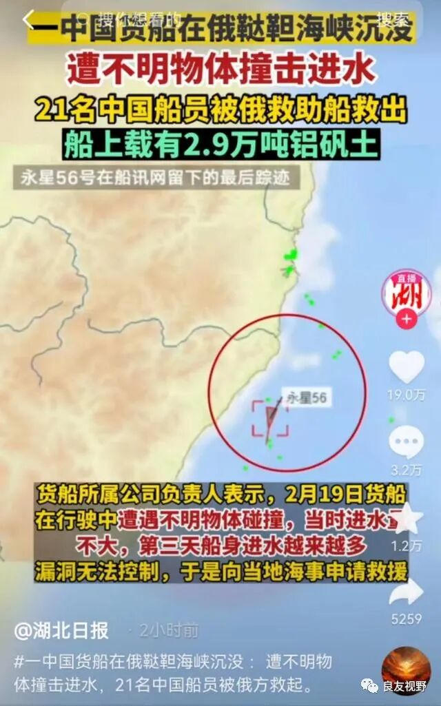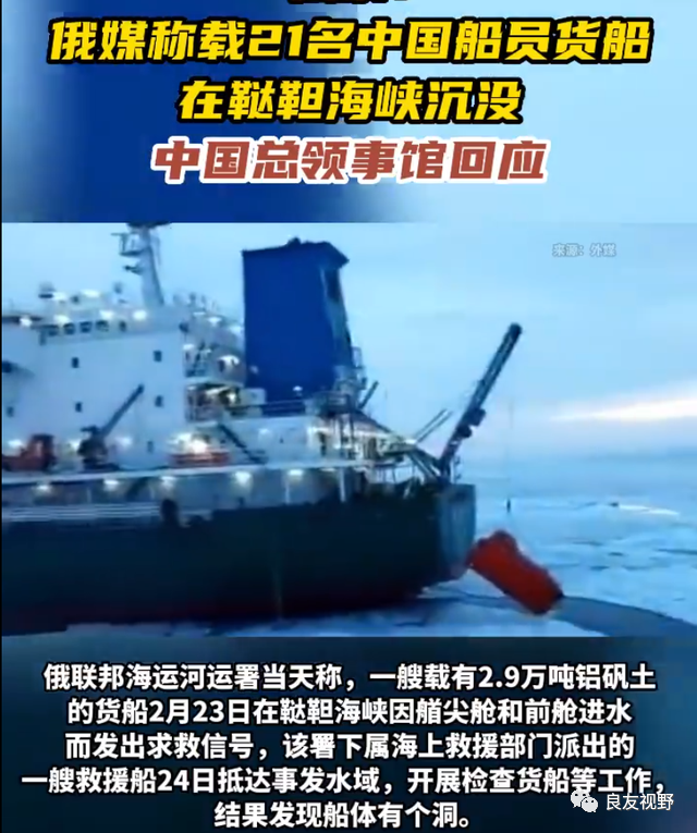 据报道,这艘载有2.9万吨铝矾土的中国货船在行至俄罗斯鞑靼海域时,突然遭遇撞击,造成船舱进水,船体侧翻,但幸运的是遭遇撞击后船员紧急向俄罗斯进行求救,接到求救信号后,俄罗斯方面也在第一时间派出了救援队组织施救,21名船员全部得救。
