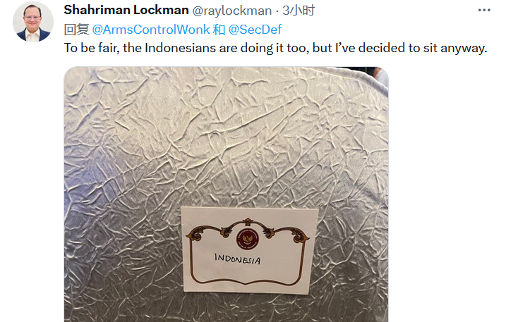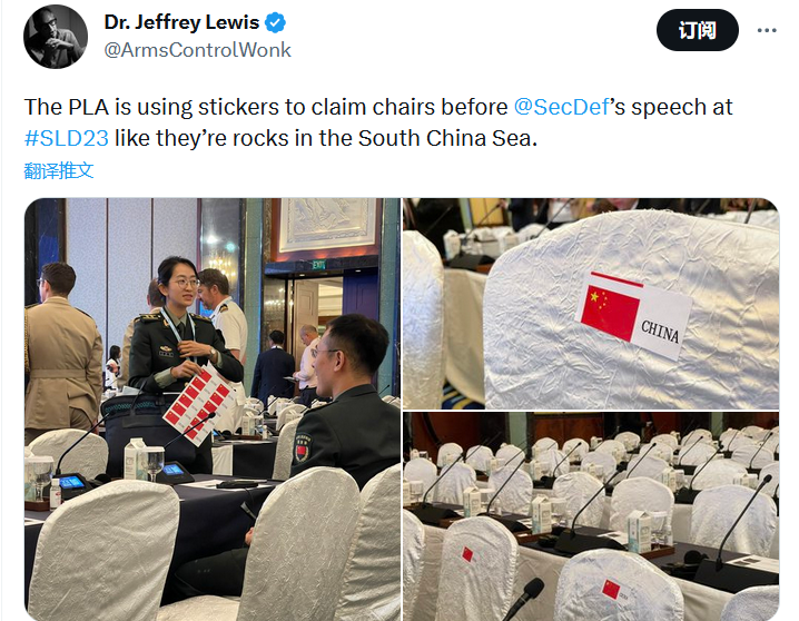 在面子上没得到好处的美国,却在其他地方开始阴阳怪气的来抹黑中国,就在香会会议开始之前,美国核武器专家杰弗里·刘易斯(Jeffrey Lewis)在社交媒体平台上发布了一条引发争议的推文。他称中国代表团在会场椅子上贴中国国旗的贴纸,并以恶意联想配文称:“在美国国防部长演讲之前,中国解放军正在用贴纸争夺椅子,就像它们是南海的岩石一样。”这一言论立刻引发了许多网友的质疑和反感。