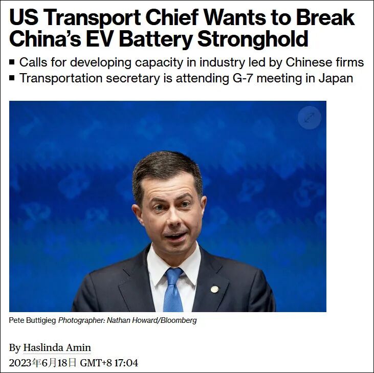 就在美国国务卿布林肯自2018年以后首次到访中国,接受中国领导人和外交部高官会见的时候,美国交通部长皮特·布蒂吉格于6月18日在日本三重县志摩市出席G7交通部长会议期间发表了关于中国电动汽车电池制造的不当言论。他提到中国在电动汽车电池领域的垄断地位,并表示美国必须削弱中国在该领域的优势,并建立关键材料的精炼能力。