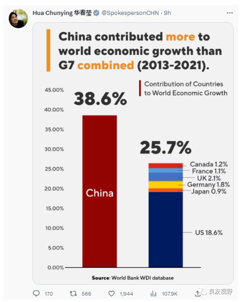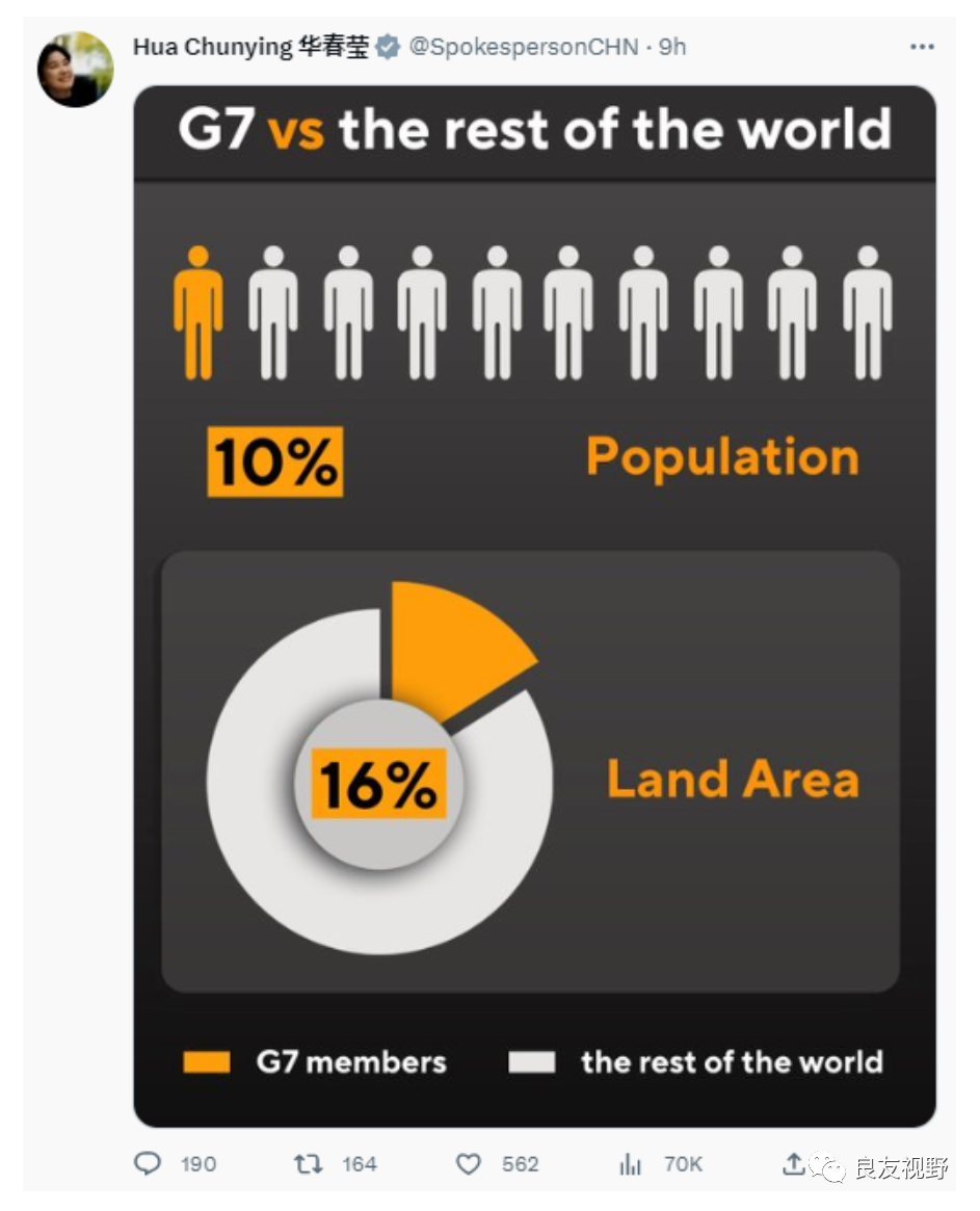 华春莹发表的推特也揭示了G7国家的一些局限性。通过数据对比,她指出中国近年来对全球经济增长的贡献率超过了G7国家总和,并展示了G7国土面积和人口在世界中的相对占比。这些数据清晰地表明,中国在国际舞台上的重要地位和影响力。