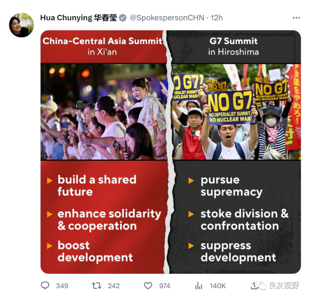 中国外交部部长助理、发言人华春莹近期也是在国外最火的社交媒体推特上连发多图多篇推文,回应广岛G7峰会的联合公报。华春莹首先在外网的社交媒体推特上发布了一组西安和广岛的对比图,一面是加强团结合作,一面是煽动分裂对抗,显示两个峰会的理念与东道国反应的不同。这一举动引发了外网激烈的讨论。
