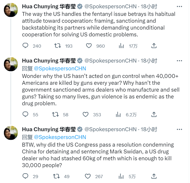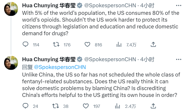 美方以涉芬太尼问题逮捕和起诉中国公民和企业,中国外交部部长助理、发言人华春莹在6月24日晚间到6月25日午间在国外社交媒体上连续发文,表达了对中国公民的保护和美国行为的不满和批评。