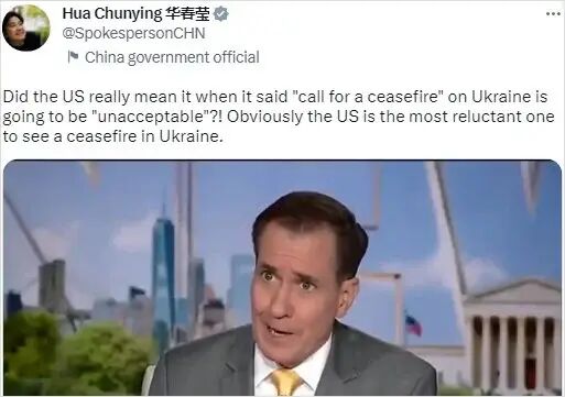 3月21日,针对白宫高官近期在采访中的惊人言论,中国外交部部长助理、发言人华春莹反问:“美国是认真的吗?”华春莹在推特上转发了一段美国媒体节目视频,并评论道:“美国说对俄乌冲突‘呼吁停火’将是‘不可接受的’,这是认真的吗?显然,美国是最不愿看到乌克兰停火的那个。”