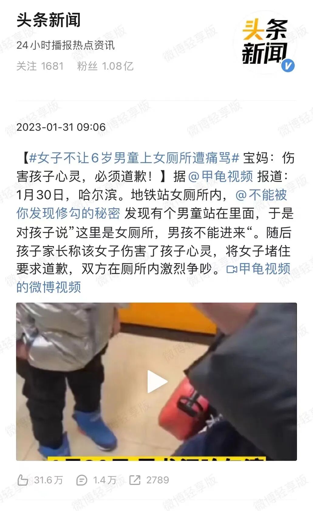 一月底,“女子不让6岁男童上女厕所遭痛骂”的话题上了微博热搜,6岁男童的妈妈痛骂女子,只因为她说“男孩不能进女厕所”,最后妈妈甚至让男童爸爸也进入女厕所辱骂女子。