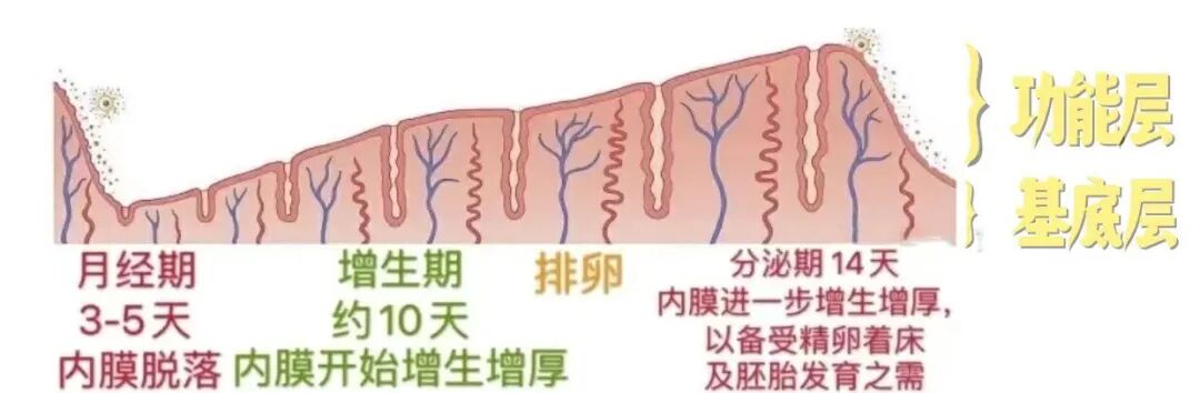 功能层是胚胎着床植入的位置,会伴随着月经周期中卵巢激素影响(卵泡生长-排卵-黄体生成-黄体萎缩)呈现出周期性的动态变化。