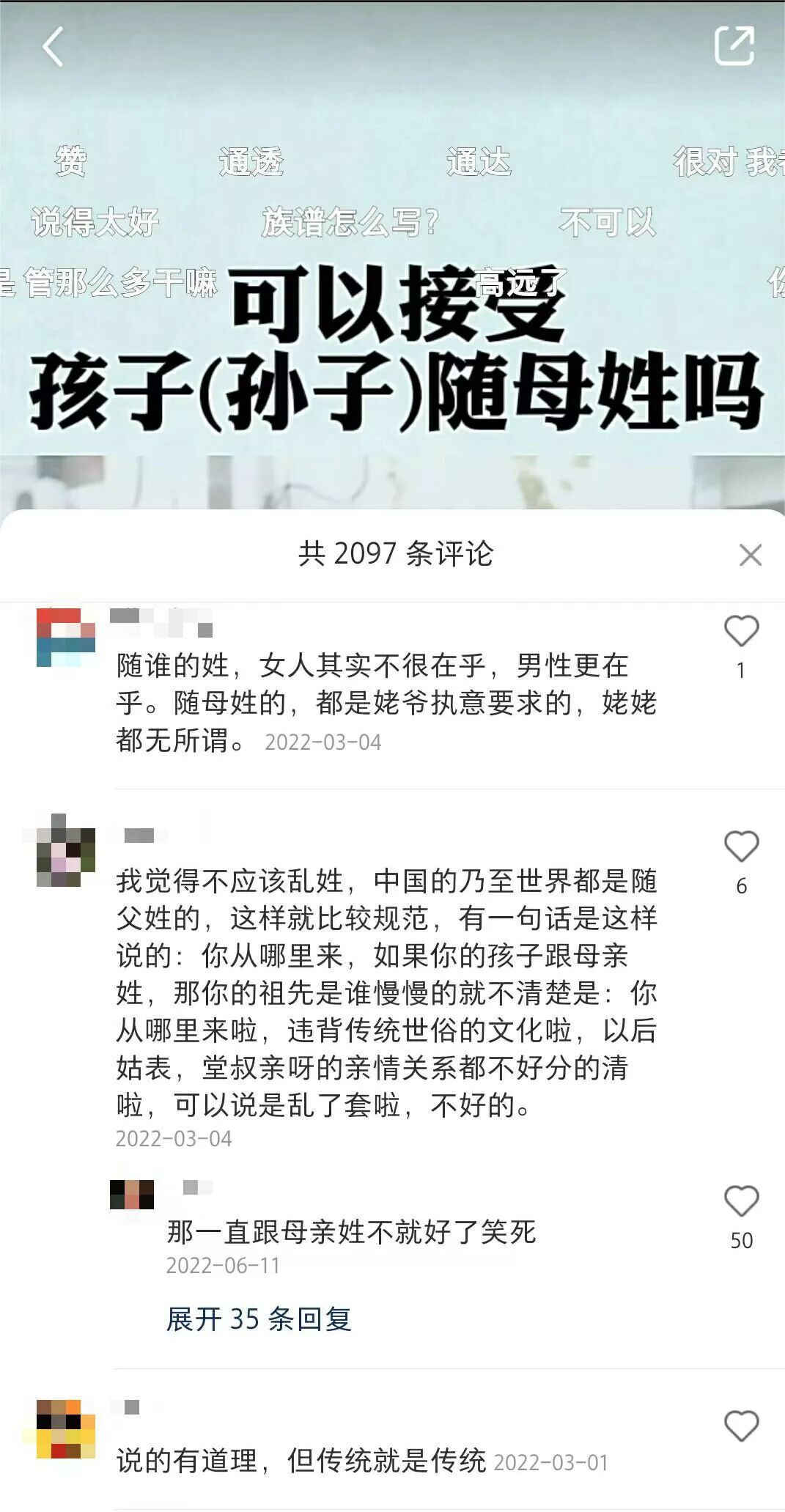 在小红书冠姓权的tag里,一条采访老人关于随母姓看法的视频推送的评论区中仍有许多认为“传统文化”不能改变,还有为老人担心族谱的弹幕。