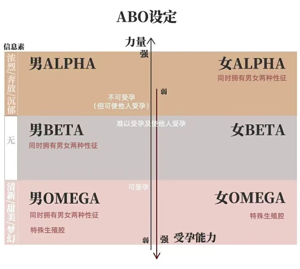 *注:ABO文学:源自欧美同人圈的一大设定,其核心设定为人类社会的一种架空性别结构,即人类被分为6种性别,男女两性分别各被分为Alpha、Beta与Omega。