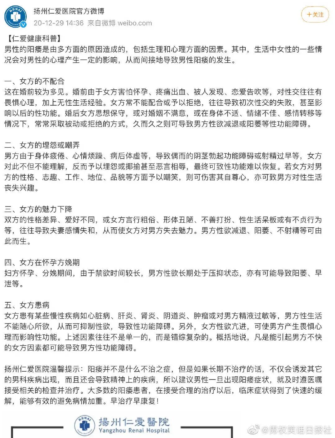 在20年年终,看到一条荒诞微博,医院官微却在指责:"男人的阳痿,都是女人的错。"