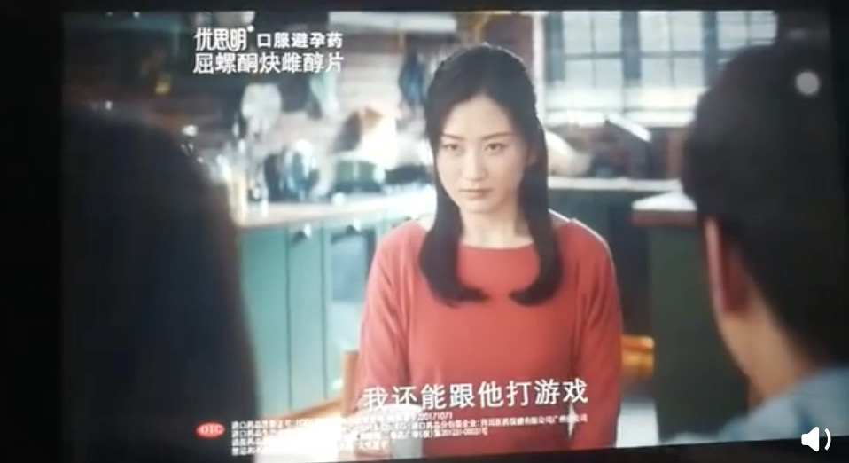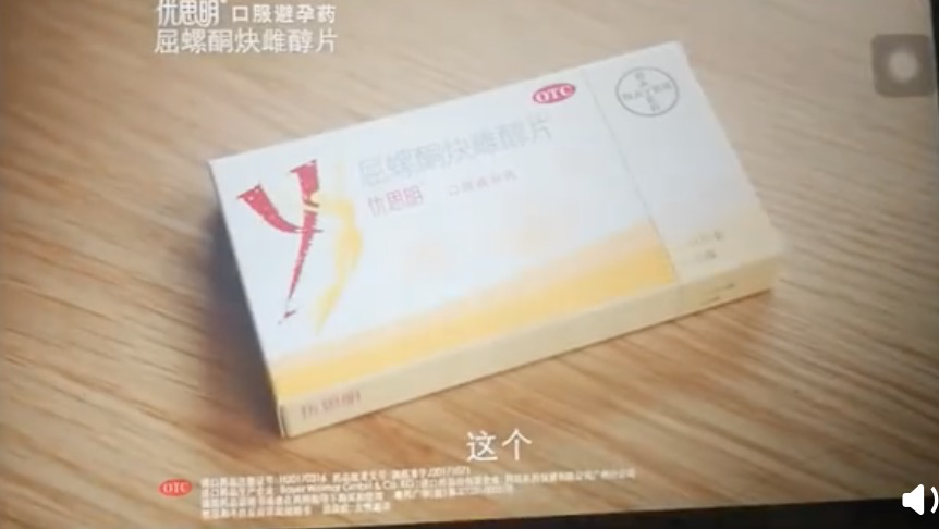镜头转到妻子那一边,妻子拍出一盒短效避孕药,并特别骄傲地说了句——