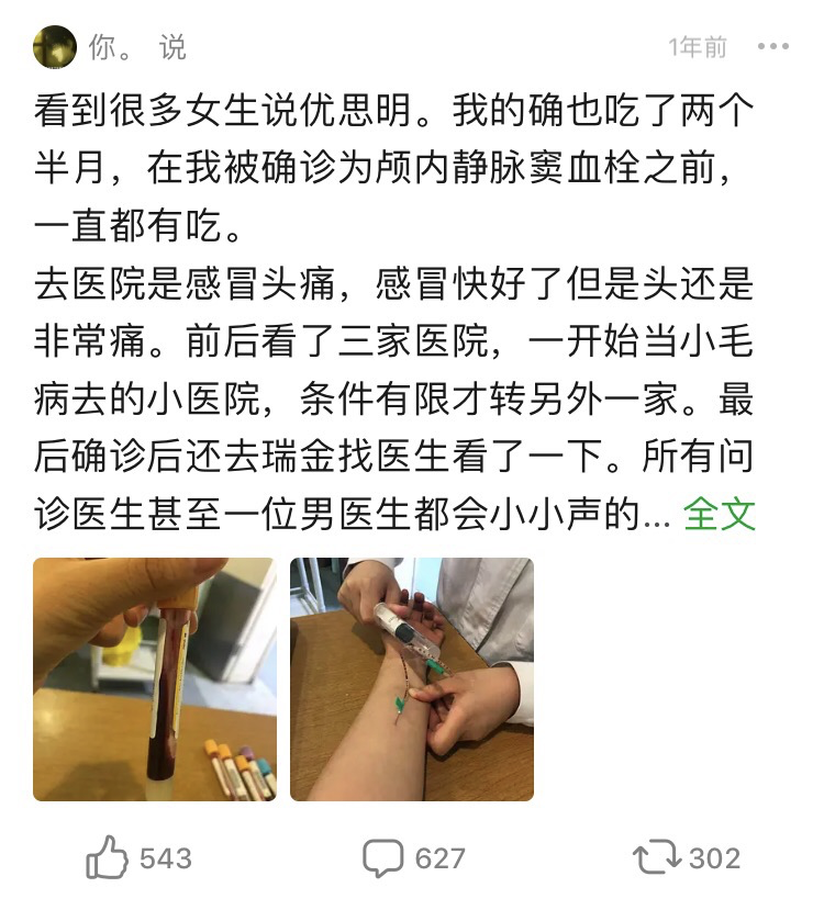 @奶啤:曾经服用过三四个月的优思明,我的不良反应并不算特别大,但也挺折磨人。主要有两个,一是抑郁情绪加重了,有时候会莫名其妙掉眼泪;二是在第一个月内一直会产生褐色分泌物,断断续续流了一个多月,之前最担心的发胖这个副作用倒是没有。
