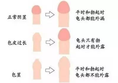 正常的丁丁在疲软和勃起时,龟头(阴茎头)都可以外漏;包皮过长的丁丁只有在勃起时才能露出真面目,平时是看不到的;包茎的丁丁则啥啥啥也看不见,愣是给藏在皮里面了。