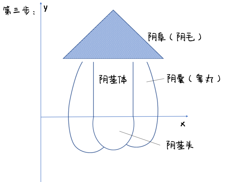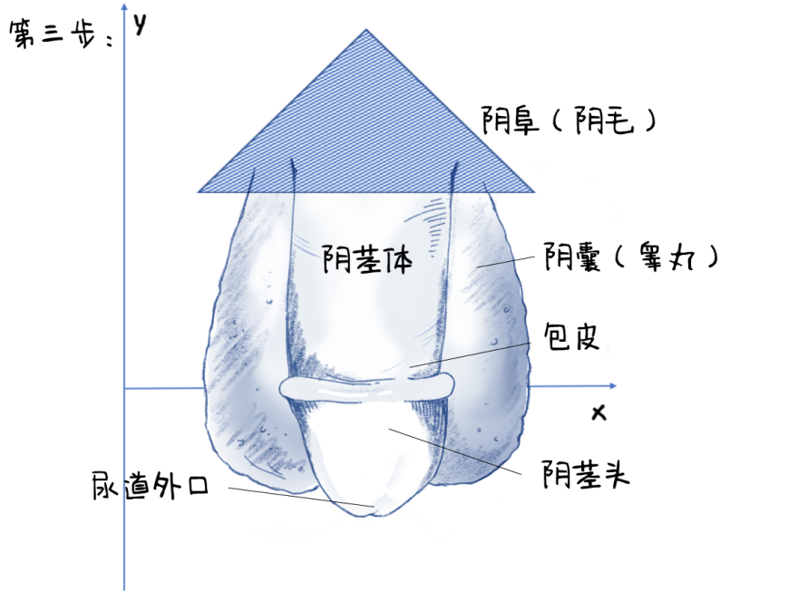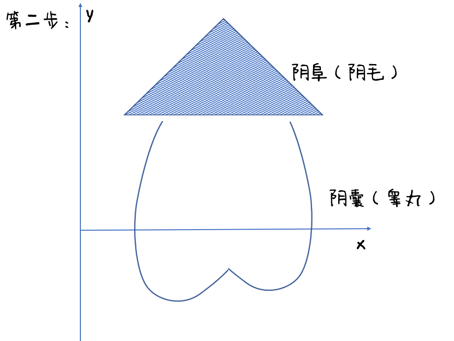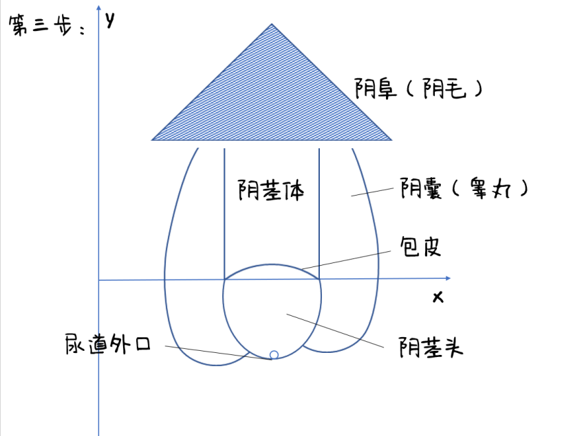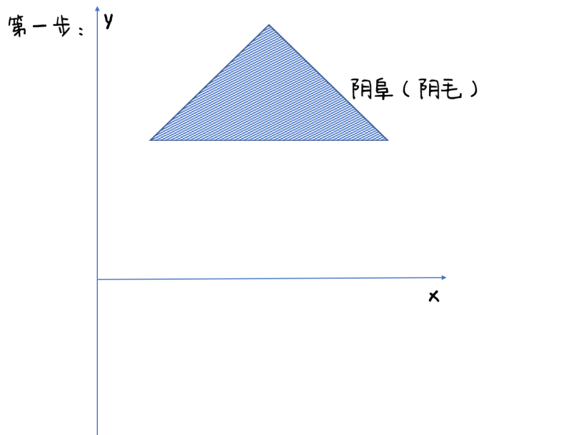 首先画出一个三角形,这里叫做阴阜,是一个用于缓冲的脂肪垫!而阴影部分可被理解为毛发,也就是阴毛,大多数成年男性都会长出阴毛!