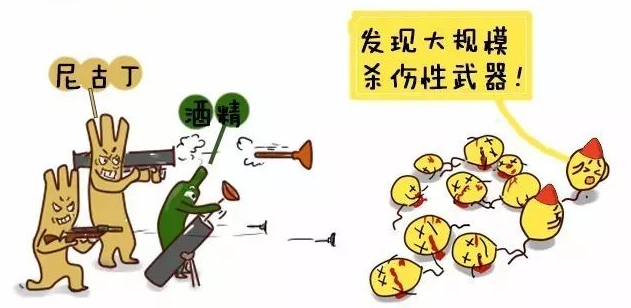 香烟里一种叫做尼古丁的有害物质,它猛烈的攻击,直接让我们一蹶不振。大量的酒精也让我们无处可逃。