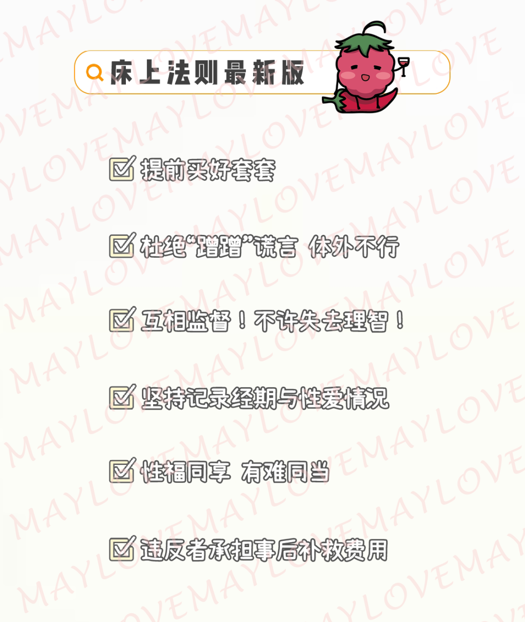 有了血泪教训之后,你们应该更不愿意让自己重新经历一遍恐孕焦虑了叭!不如趁这个机会,和伴侣一起制定你专属的”床上法则“。一起面对性爱风险,一起朝着更美好安全的性爱前进。