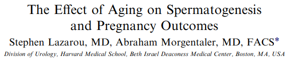 [1] Lazarou, S. and Morgentaler, A. (2008). The Effect of Aging on Spermatogenesis and Pregnancy Outcomes. Urologic Clinics of North America, 35(2), pp.331–339. doi:10.1016/j.ucl.2008.01.006.