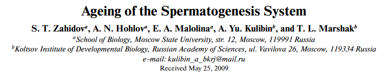 [4] Zahidov, S.T., Hohlov, A.N., Malolina, E.A., Kulibin, A.Yu. and Marshak, T.L. (2010). Ageing of the spermatogenesis system. Biology Bulletin, 37(1), pp.10–17. doi:10.1134/s1062359010010024.