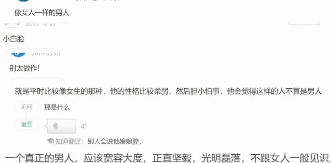 以至于,当他们发现生活里有男生不同于标准的时候,便会投去鄙夷的目光,就像给他印上了“真男人质检不成功”的标签。