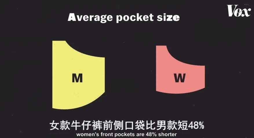 当第一条女士牛仔裤诞生时,口袋比男士的小了大约1/4,自此以后,为了显示身材和穿着舒适,女式裤子的口袋成为了时尚的牺牲品。
