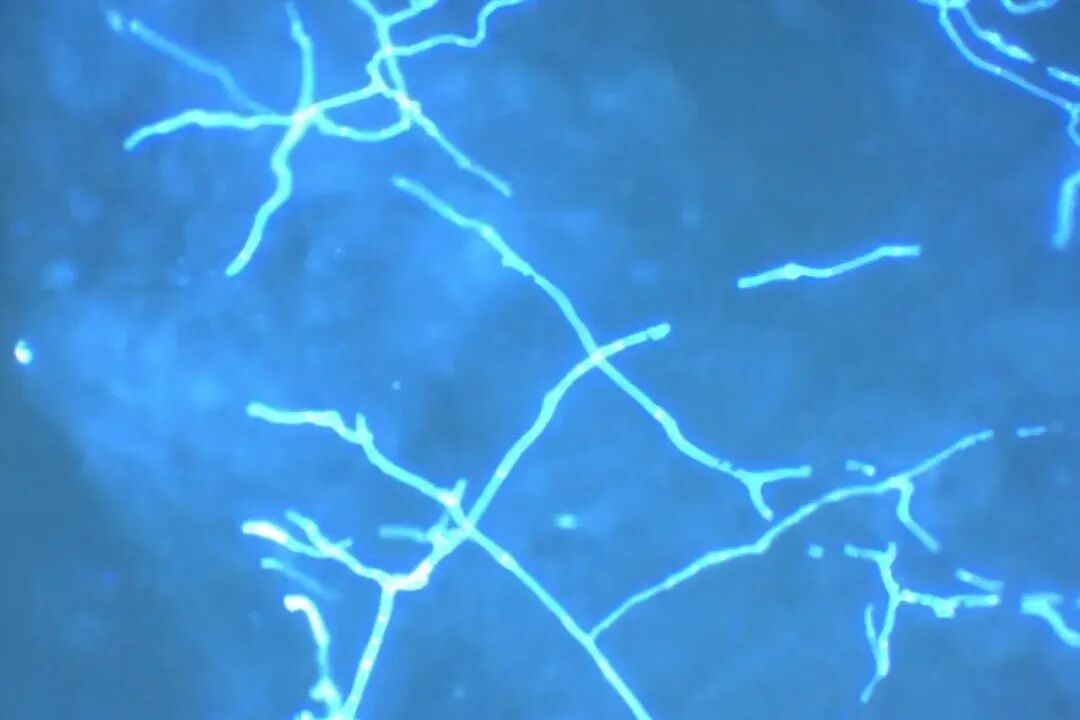 图:真菌感染时,取皮屑荧光染色后,镜下可见真菌菌丝