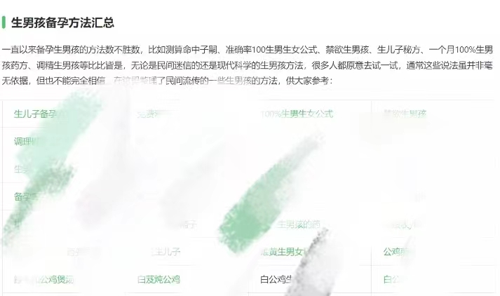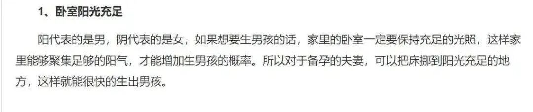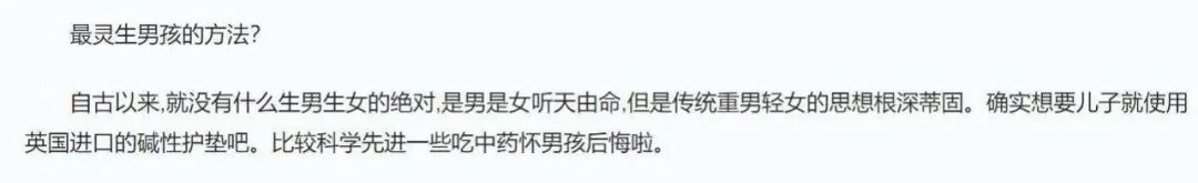 那些母婴网站上的“生子妙方”文章,明明每个都在开头中口口声声提倡要科学备孕,生男生女都一样,人为不能干预性别,但每当到文末,又会附上“准确率100%”的妙方大全,说“供大家参考。”