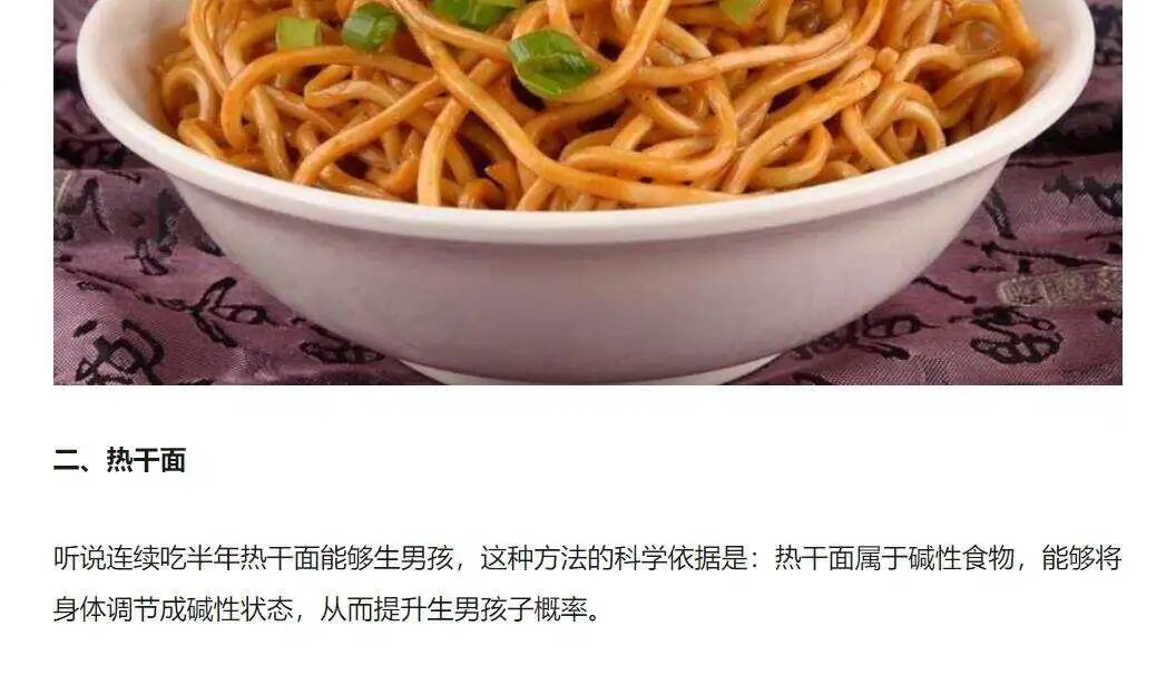 现代呢,有谣言说如果阴道环境偏碱性的话会好生儿子,就让人吃大半年热干面的,因为......热干面是碱性的。