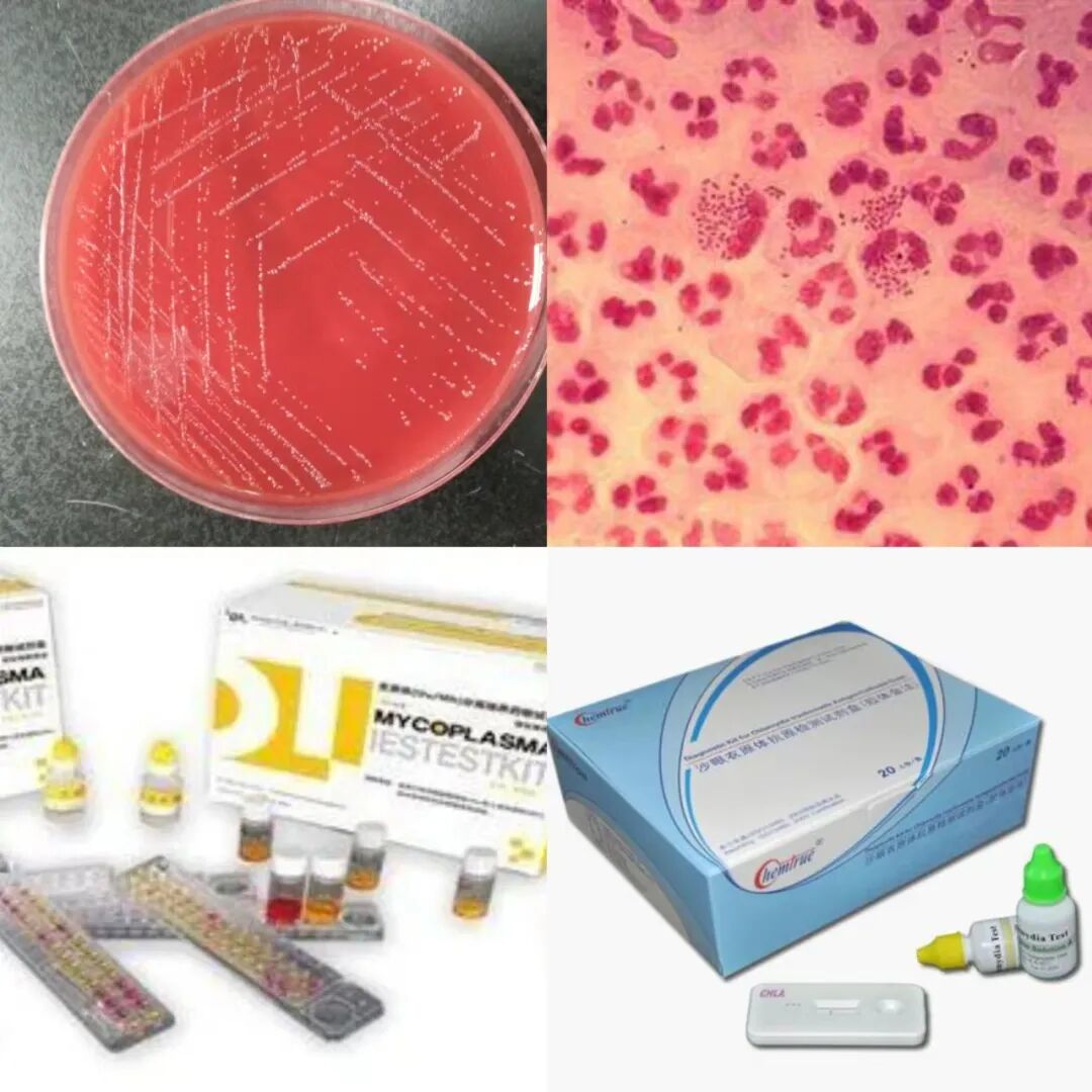 图分别为淋球菌培养、淋球菌镜检、支原体培养及衣原体快速法