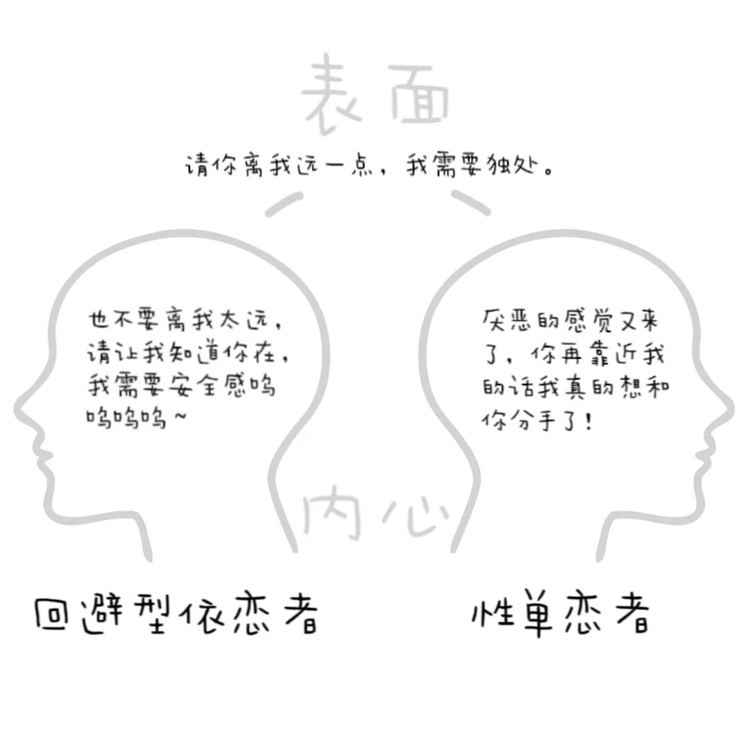 从触发场景看,回避型依恋者无法正常进入甚至下意识抗拒进入亲密关系;而性单恋者仅仅在爱情这种类型的亲密关系中表现出强烈回避。