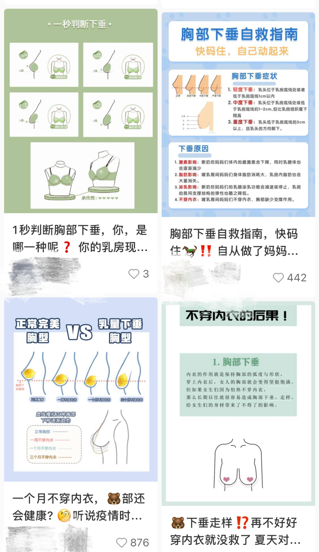 而且如果在某书搜索乳房下垂,就会出现很多有关“乳房下垂自救指南”等相关的介绍。点进去一看,发现要么是内衣广告,要么就是在神化一些运动的作用。