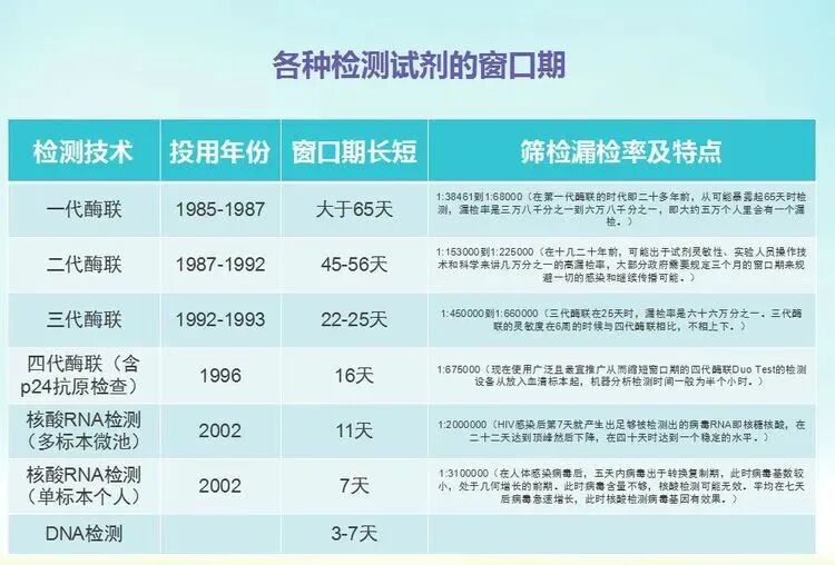 需要注意的是,上述时间是不同个体感染HIV平均检测出来的时间,而个体情况不同、检测试剂不同,检测的窗口期也不同,所以有可能会出现:你阳了但检测出来是阴的情况。