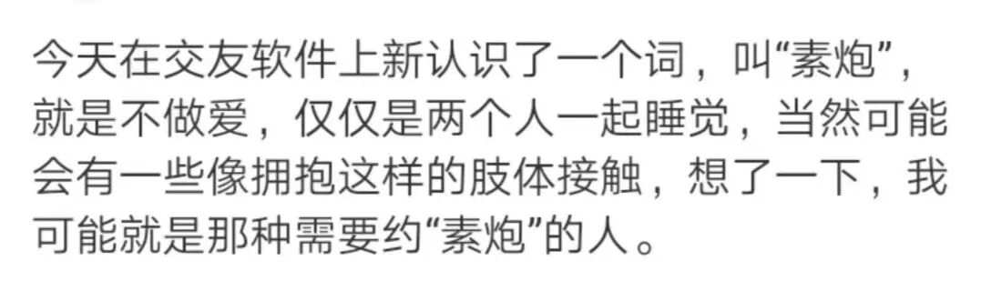 而“素炮”的定义相对复杂:两人不需要、也并不会发生关系,“对亲密的渴望大于性需求”,只是做有非插入式亲密接触的睡觉伴侣。
