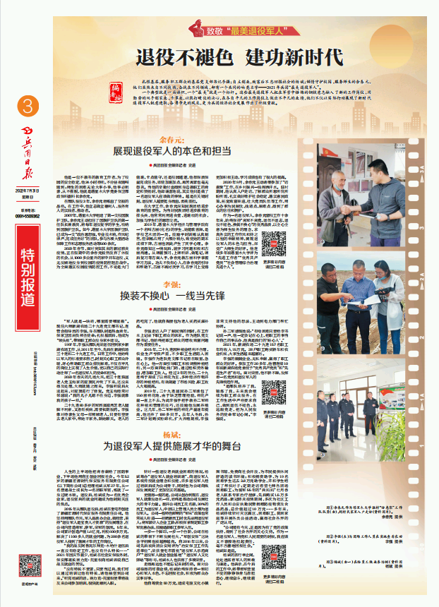 扎根基层、服务职工群众的基层党支部书记李强;自主创业,致富后不忘回报社会的杨斌;倾情守护校园、服务师生的余春元,他们虽然来自不同战线,奋战在不同领域,却有一个共同的响亮名字——2021年兵团“最美退役军人”。