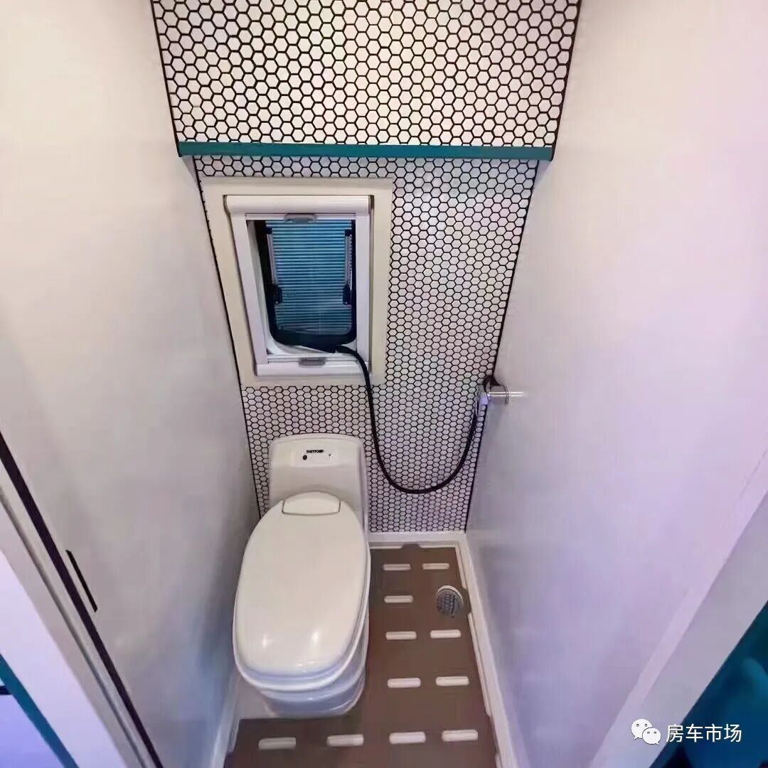 车内设计有前置的独立卫生间,地板配有防水柚木,可防滑能隔水。配有进口盒式马桶(带17L黑水箱)、外推窗、淋浴花洒、换气扇。水路方面,配有150L净水箱以及50L灰水箱。
