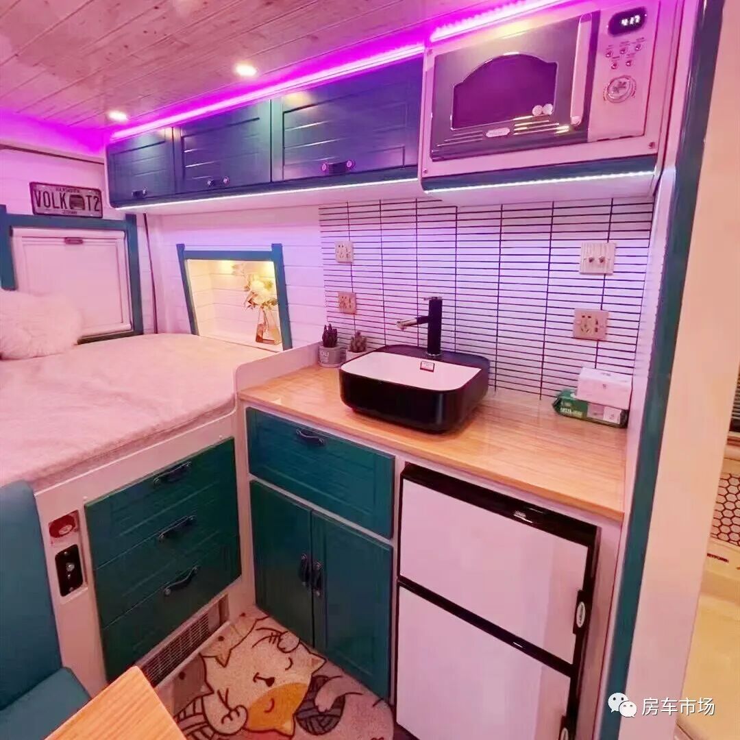 车内配色清新自然,非常具有设计感。驾驶舱后部是就餐区,配有餐桌和对坐沙发。内侧为厨房操作台,配有陶瓷水池+水龙头、微波炉、储物柜子以及12V-133L双开门车载冰箱。整车采用水性聚氨酯发泡保温,并通过隔音处理。
