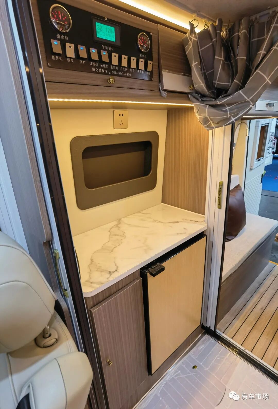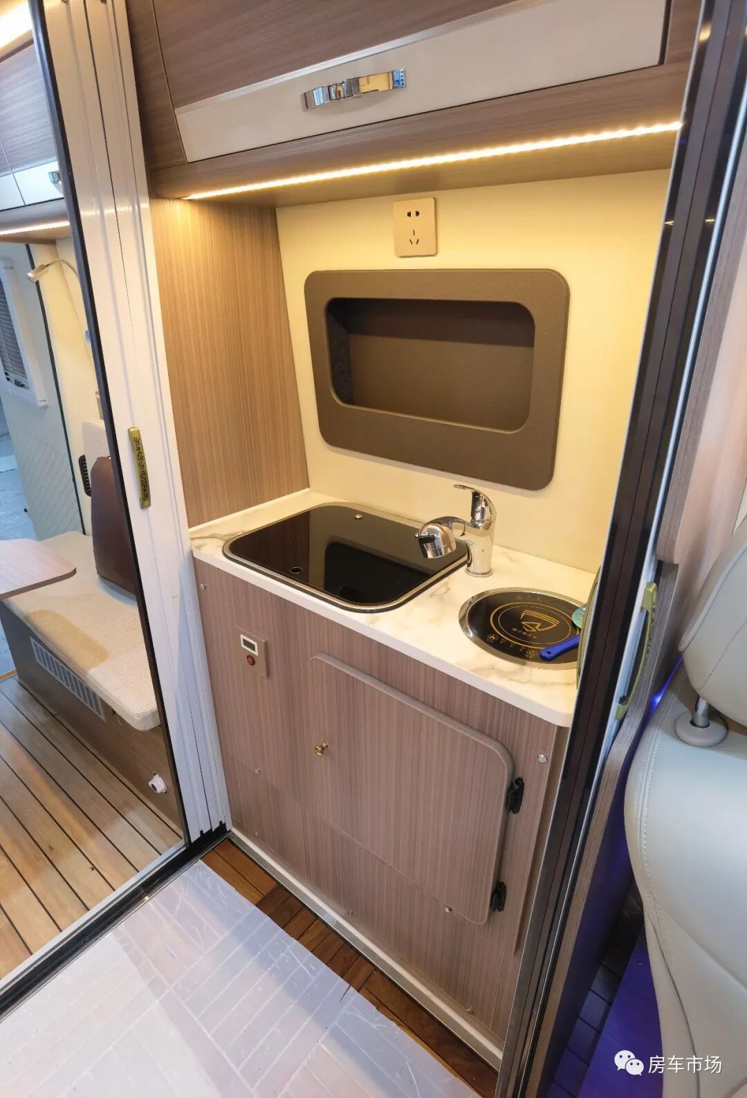 中部集中设计为厨卫区,配置了洗菜盆、电磁炉、储物柜、12/70L车载冰箱、防水浴帘、抽拉式水龙头以及便携式马桶。厨卫区两侧配有防水推拉门,可前后分隔为两个独立区域,功能完善,设计巧妙。总控面板位于厨卫区一侧的上部,采用物理按键可操控车内的电器设备,还能及时查看电池电量以及水箱水位。