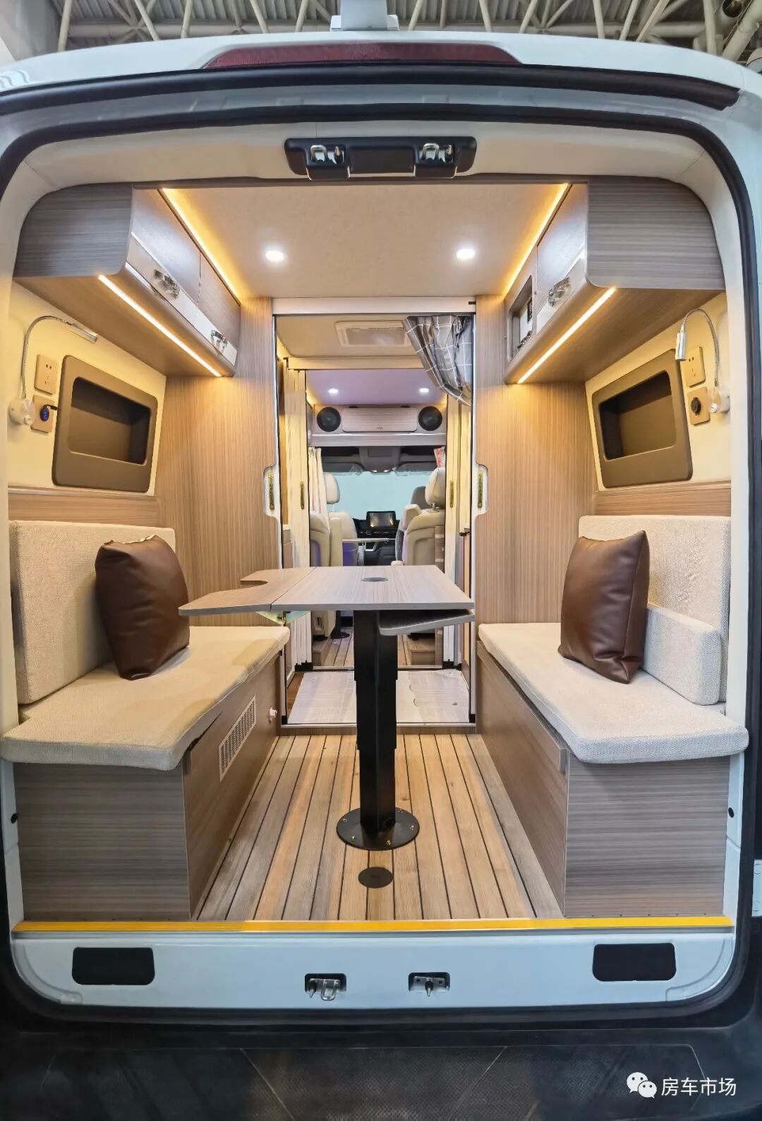 后部设计成集会客与休息功能一体的区域,日常模式可作为休闲娱乐区,对坐式沙发中间配有升降餐桌,餐桌采用翻折拓展的结构用以增加使用面积。睡眠模式下可组合拼成一张双人床。两侧都安装有五孔插座以及阅读灯,顶部是储物的吊柜以及一台12V驻车空调。