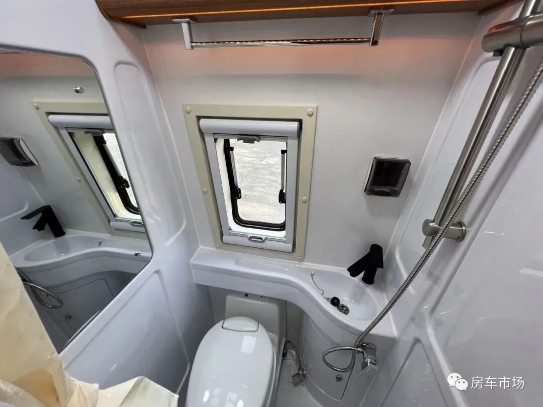中部设计为厨卫区,与常规布局不同的是车友定制了双会客区,尾部并未配置固定大床,而是采用卡座与餐桌的组合。厨卫区空间表现不错,多功能橱柜配有电磁炉、洗菜池+水龙头、12V-133L双开门冰箱、微波炉、车载吸油烟机等。同时该车还加装了后部行车空调。独立卫浴设计在对面,配有电动旋转马桶(带17L黑水箱)、淋浴花洒、化妆镜、外推窗以及换气扇。